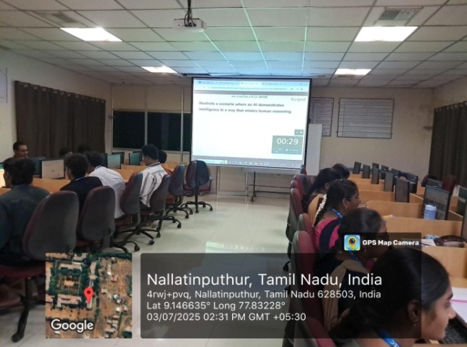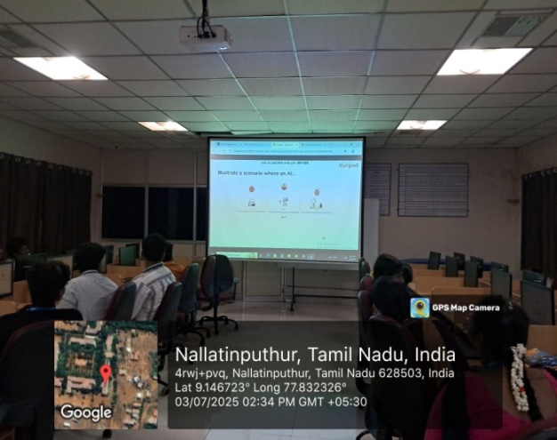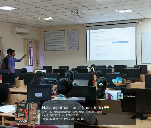 Students work collaboratively to define the problem statement, gather or simulate datasets, build AI models or intelligent agents, evaluate system performance, and present the final solution. The activity bridges theoretical learning with practical implementation, helping students gain hands-on experience aligned with real industrial expectations.