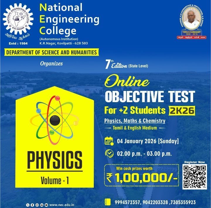 நேஷனல் பொறியியல் கல்லூரி நடத்தும் 7th State Level Online Objective Test – 2K26 – இல் பதிவு செய்து பங்கேற்கும் உங்கள் அனைவருக்கும் எங்களின் மனமார்ந்த நன்றிகளும் வாழ்த்துகளும்…!!