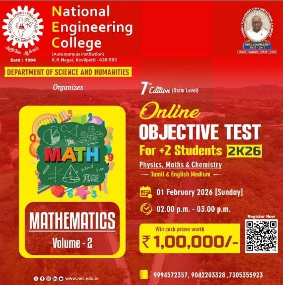 Online Objective Test - 2K26 7th State Level Online Objective Test – 2K26 (Exclusively for +2 Students) Tamil Medium: https://forms.gle/SPPdcUWeR9yQeyFq9 English Medium: https://forms.gle/E6NwPfjbhFhyy4w19 Click here to Registration