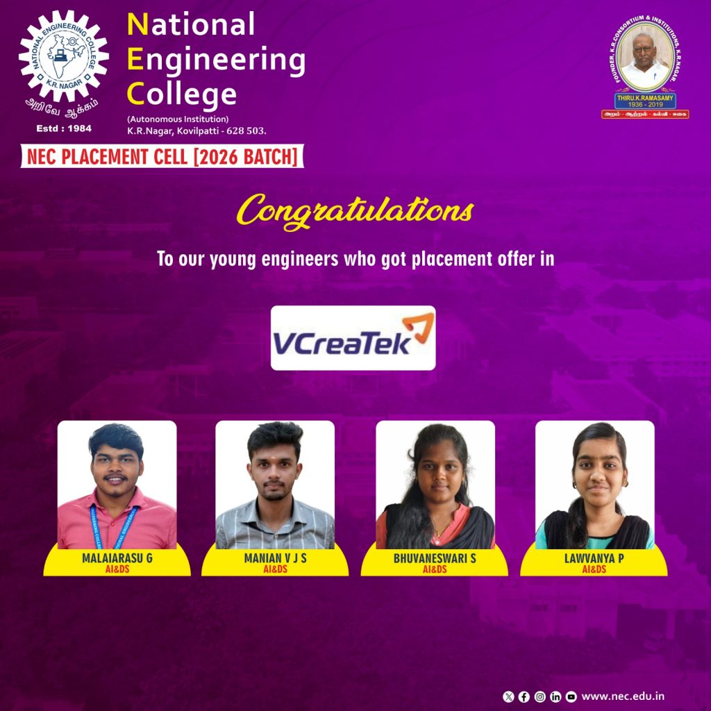 | 349 | 2217010 | MALAIARASU G | AI&DS | M/S.VCREATEK CONSULTING SERVICES PVT LTD, BENGALURU. |