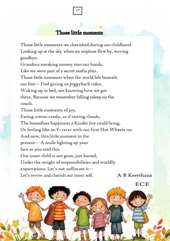 14Those littlemomentsThoselittlemomentswecherishedduringourchildhoodLookingupattheskywhenanairplaneflewby,wavinggoodbye. Grandmasneakingmoneyintoourhands,Likewewerepartofasecretmafiaplan.Thoselittlemomentswhentheworldfeltbeneathourfeet%u2014Dadgivinguspiggybackrides,Wakingupinbed,notknowinghowwegotthere, Becausewerememberfallingasleeponthecouch.Thoselittlemomentsofjoy,Eatingcottoncandy,asiftastingclouds,TheboundlesshappinessaKinderJoycouldbring,OrfeelinglikeanF1racerwithourfirstHotWheelscar.Andnow,thislittlemomentinthepresent%u2014Asmilelightingupyourfaceasyoureadthis.Ourinnerchildisnotgone,justburied,Undertheweightofresponsibilitiesandworldlyexpectations. Let%u2019s not suffocate it%u2014Let%u2019sreviveandcherishourinnerself.ARKeerthanaECE-13