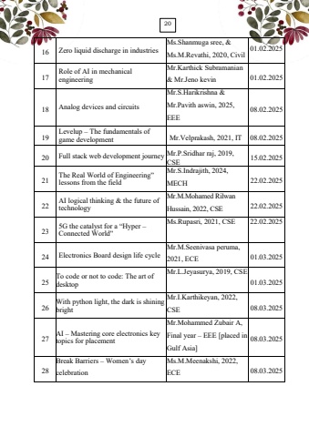 2116Zero liquid discharge in industriesMs.Shanmuga sree, & Ms.M.Revathi, 2020,Civil01.02.202517Role of AI in mechanical engineering Mr.Karthick Subramanian & Mr.Jeno kevin01.02.202518Analog devices and circuitsMr.S.Harikrishna & Mr.Pavith aswin, 2025, EEE08.02.202519Levelup %u2013The fundamentals of game developmentMr.Velprakash, 2021, IT08.02.202520Full stack web development journeyMr.P.Sridhar raj, 2019, CSE15.02.202521The Real World of Engineering%u201d lessons from the fieldMr.S.Indrajith, 2024, MECH22.02.202522AI logical thinking & the future of technologyMr.M.Mohamed Rilwan Hussain, 2022, CSE22.02.2025235G the catalyst for a %u201cHyper %u2013Connected World%u201dMs.Rupasri, 2021, CSE22.02.202524Electronics Board design life cycleMr.M.Seenivasa peruma, 2021, ECE01.03.202525To code or not to code: The art of desktopMr.L.Jeyasurya, 2019, CSE01.03.202526With python light, the dark is shining brightMr.I.Karthikeyan, 2022, CSE08.03.202527AI Mastering core electronics key topics for placementMr.Mohammed Zubair A,Final year %u2013EEE [placed in Gulf Asia]08.03.202528Break Barriers %u2013Women%u2019s day celebrationMs.M.Meenakshi, 2022, ECE08.03.202520