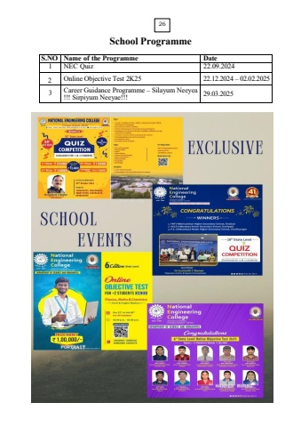 25SchoolProgrammeS.NONameoftheProgrammeDate1NECQuiz22.09.20242OnlineObjectiveTest2K2522.12.202402.02.20253Career Guidance Programme Silayum Neeyea !!! Sirpiyum Neeyae!!!29.03.202526