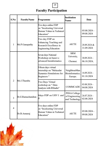 27Faculty ParticipationS.NoFacultyNameProgrammeInstitutionNameDate1Mr.P.GanapathyFive days online FDPon %u201cInculcating Universal Human Values in Technical Education%u201dAICTE05.08.2024-09.08.2024Two day FDP onEnhancing Teaching and ResearchExcellence in Engineering Education28.09.2024&31.09.20242Mr.J.ThambaSevan days NationalWorkshop on basict o advanced bioinformaticsSRMUniversity, Chennai.30.09.2024-06.10.2024,Fifteen days virtualinternship on \Dynamics Simulations for Begineers \NeighbourMan Bioinformatics, Europe.16.09.2024-01.10.2024Two Days Virtualworkshop on \Analysis with RStudio\COMMCADE03.08.2024-04.08.20243Dr.E.Ramachandran8daysFDPonUHVIand II PSNA Collegeof Engineering and Technology26.07.2024-02.08.20244Dr.B.AnnarajFive days online FDPon %u201cInculcating Universal Human Values in Technical Education%u201dAICTE05.08.2024-09.08.202428