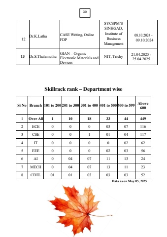 2912Dr.K.LathaCASE Writing, Online FDPSYCSPM%u2019SSINHGAD,Institute of Business Management08.10.2024-09.10.202413Dr.S.ThalamuthuGIAN %u2013Organic Electronic Materials and DevicesNIT, Trichy21.04.2025 -25.04.2025Skillrackrank%u2013DepartmentwiseSi NoBranch101 to 200201 to 300301 to 400401 to 500500 to 599Above 6001OverAll1101833444492ECE00003071163CSE00101041174IT000002625EEE0000203566AI004071113247MECH004071311238CIVIL010103030352DataasonMay 05,202530