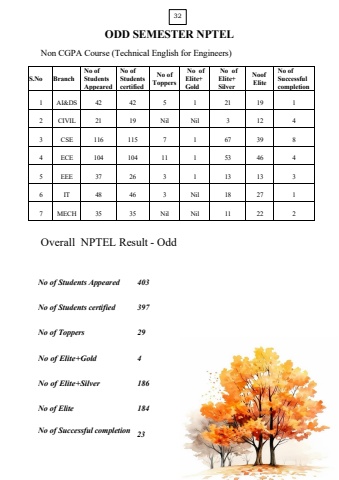 31ODD SEMESTERNPTELNon CGPA Course (Technical English for Engineers) S.NoBranchNo of Students AppearedNo of Students certifiedNo of ToppersNo of Elite+ GoldNo of Elite+ SilverNoof EliteNo of Successful completion1AI&DS424251211912CIVIL2119NilNil31243CSE11611571673984ECE104104111534645EEE372631131336IT48463Nil182717MECH3535NilNil11222OverallNPTELResult -OddNoofStudentsAppeared403NoofStudentscertified397NoofToppers29NoofElite+Gold4NoofElite+Silver186NoofElite184NoofSuccessfulcompletion2332