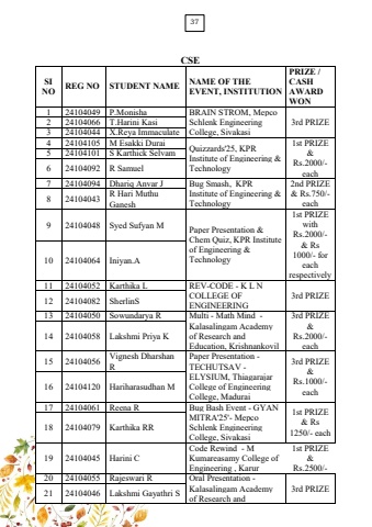 CSESI NOREG NOSTUDENT NAMENAME OF THE EVENT, INSTITUTIONPRIZE / CASH AWARD WON124104049P.MonishaBRAIN STROM, Mepco Schlenk Engineering College, Sivakasi224104066T.Harini Kasi3rd PRIZE324104044X.Reya Immaculate424104105M Esakki DuraiQuizzards'25, KPR Institute of Engineering & Technology1st PRIZE & Rs.2000/-each524104101S Karthick Selvam624104092R Samuel 724104094Dhariq Anvar JBug Smash, KPR Institute of Engineering & Technology2nd PRIZE & Rs.750/-each824104043R Hari Muthu Ganesh924104048Syed Sufyan MPaper Presentation & Chem Quiz, KPR Institute of Engineering & Technology1st PRIZE with Rs.2000/-& Rs 1000/-for each respectively1024104064Iniyan.A1124104052Karthika LREV-CODE -K L N COLLEGE OF ENGINEERING3rd PRIZE1224104082SherlinS1324104050Sowundarya RMulti -Math Mind -Kalasalingam Academy of Research and Education, Krishnankovil3rd PRIZE & Rs.2000/-each1424104058LakshmiPriya K1524104056Vignesh Dharshan RPaper Presentation -TECHUTSAV -ELYSIUM, Thiagarajar College of Engineering College, Madurai3rd PRIZE & Rs.1000/-each1624104120Hariharasudhan M1724104061Reena RBug Bash Event -GYAN MITRA'25'-Mepco Schlenk Engineering College, Sivakasi1st PRIZE & Rs 1250/-each1824104079Karthika RR1924104045Harini CCode Rewind -M Kumareasamy College of Engineering , Karur1st PRIZE & Rs.2500/-2024104055Rajeswari ROral Presentation -KalasalingamAcademy of Research and 3rd PRIZE2124104046Lakshmi Gayathri S37