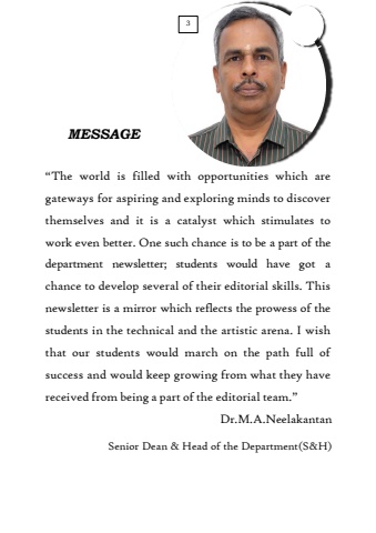 %u201cTheworldisfilledwithopportunitieswhicharegatewaysfor aspiringandexploringmindstodiscoverthemselvesanditisa catalystwhichstimulatestoworkevenbetter.Onesuchchance isto bea part ofthe department newsletter;students would have got a chance to develop several of their editorial skills. This newsletterisamirrorwhichreflectstheprowessofthestudents inthetechnicalandtheartisticarena.Iwishthatourstudents would march on the path full of success and would keep growingfromwhattheyhavereceivedfrombeingapartofthe editorialteam.%u201dDr.M.A.Neelakantan SeniorDean& HeadoftheDepartment(S&H)3MESSAGE